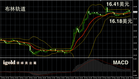 白银阴阳烛录得布林轨道区间收平,且柱体处于红色日均线中位,短线MACD显示多头回落,白银价格下午持稳后或不断突破16.35美元附近。