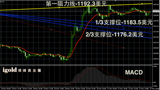 技术回顾:午评中,我们指出金价在未能突破1190美元后,会逐渐进行区间回调,并且明确给出了1184-1192美元的区间,下午市场的回落点位与我们的预测完全一致。