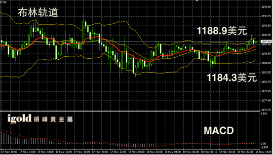黄金阴阳烛录得布林轨道区间收平,末端柱体小幅高于红色日均线,短线MACD显示呈中性,黄金价格下午或偏多整理,小幅上探1188美元附近,美指未跌破87.8之前,市场反弹阻力较大,偏于横盘运行。