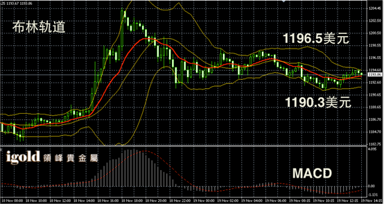 黄金阴阳烛录得柱体收短,且整体处于红色日均线中位,布林轨道区间收窄,短线MACD显示呈中性,短线金价或不断持稳1193美元附近震荡,美指若跌破87.7,市场或突破至1196美元附近。