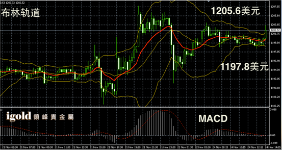 黄金阴阳烛录得布林轨道收窄,柱体高低交叉于红色日均线,短线MACD显示呈中性,黄金价格下午或继续在1200美元附近整理,建议关注1197-1205美元区间。目前美指速度下降,所以金价反弹缺乏动力。