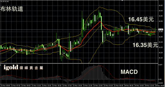 白银阴阳烛录得柱体较短,且整体处于红色日均线中位,布林轨道录得区间收窄,短线MACD显示呈中性,白银价格下午或继续浮动在16.4美元附近。