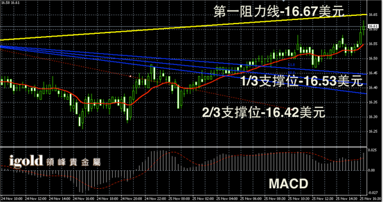 白银阴阳烛录得柱体高于红色日均线,后期阳烛增多,且短线MACD显示多头主导,白银价格短线或首先对16.6美元进行加固。若能够持稳或向16.65美元附近攀升,跌破或回调至16.55美元附近。