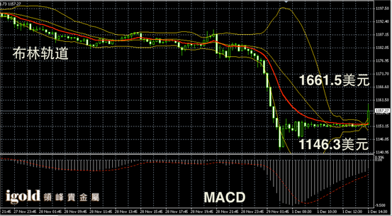 黄金阴阳烛录得柱体收短,且整体处于红色日均线,布林轨道录得区间收窄,短线MACD显示弱势空头主导,黄金价格午后或有小幅上探,但是在未突破1160美元前或仍回落。