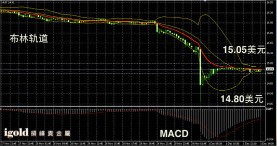 白银阴阳烛录得回调后,布林轨道录得收窄,柱体聚焦在红色日均线中位,短线MACD显示弱势空头主导。白银价格午后或继续在14.9美元附近徘徊。市场若不能持稳15美元,后续空头或加大。