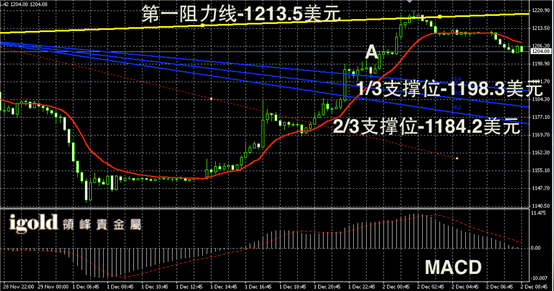 黄金阴阳烛录得反弹后,柱体收短,末端回落至红色日均线中位,短线MACD显示呈中性,黄金价格或整体在1202美元附近持稳,并偏于小幅上探1208美元。低位支撑若跌破1202美元,或重回1197美元附近整理。