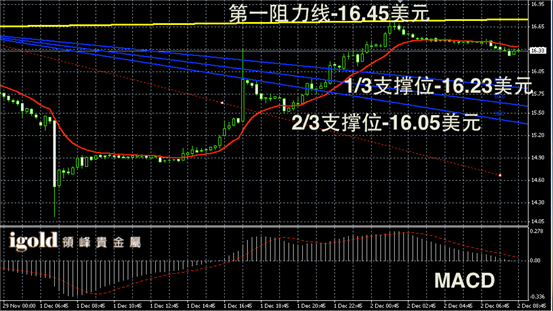 白银日线走势末端录得连续阳烛,且持稳红色日均线,长线RSI录得51,不断反弹,小时线显示反弹后有所回落,目前16.3美元附近可做短线支撑。白银价格目前呈现宽幅震荡趋势,所以运行区间或加大至16.1-16.4美元区间。