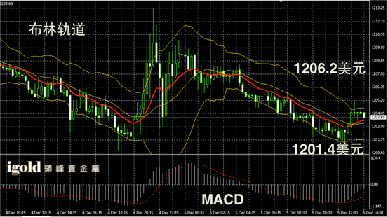 黄金阴阳烛录得柱体低于红色日均线,短线MACD显示弱势空头主导,布林轨道下探后末端收平,金价下午或在1202美元附近弱势盘整,低位若跌破1200美元,或进而下行至1196美元附近,美指若回落,金价能否有效突破取决于是否突破1205.6美元。
