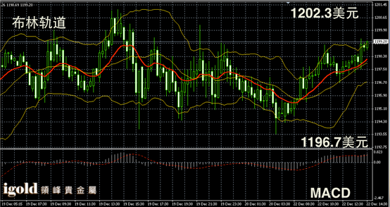黄金阴阳烛录得后期阳烛增多,小幅高于红色日均线,短线MACD显示弱势多头主导,布林轨道反弹后收平,黄金价格下午或在1198美元附近整理,并可能再次上探1200美元附近。