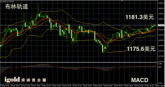 黄金阴阳烛录得阳烛小幅上探,后期柱体高于红色日均线,短线MACD显示呈中性,布林轨道录得区间上升。黄金价格下午或不断上探1180美元附近。