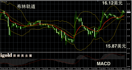 白银阴阳烛录得上升后,柱体持稳在红色日均线中位,短线MACD显示弱势多头主导,白银价格或在16美元附近横盘运行。短线运行区间可参考15.95-16.1美元区间。