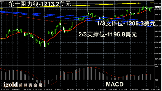 黄金阴阳烛录得后期处于红色日均线中位,短线MACD显示多头主导,黄金价格短线或小幅回调至1207美元附近,高位未突破1211美元前或难以形成新的反弹趋势。