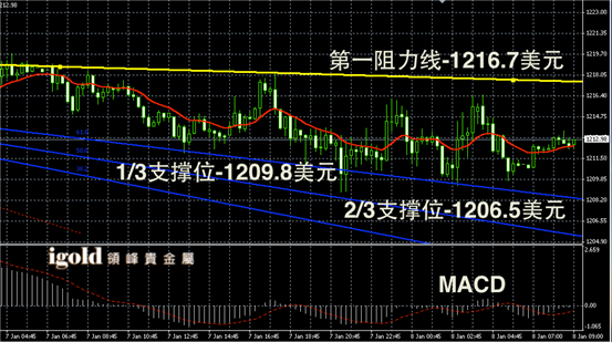 技术回顾:昨晚的评论中,我们指出金价的运行区间会在1211-1219美元区间,这一判断符合昨晚市场的运行,尤其是低位支撑的预测。