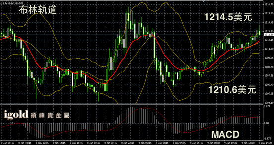 黄金阴阳烛录得小幅攀升,末端柱体小幅高于红色日均线,短线MACD显示弱势多头主导,布林轨道录得小幅上探,短线金价在1214美元附近阻力较大,午后或小幅回落至1212美元附近盘整。