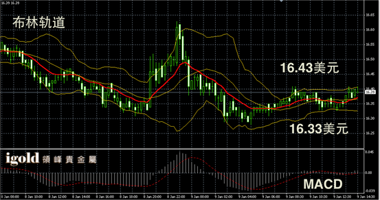 白银阴阳烛录得柱体较短,后期小幅收高,布林轨道录得区间收平。白银价格或继续在16.38美元附近横盘运行。短线或小幅上探16.43美元附近。