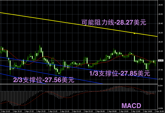 白银阴阳烛录得柱体较短,且前后比值差异小,聚焦明显,整体趋势平缓,短线MACD也没有明显的多头或空头趋势,未来后继续区间窄幅震荡。