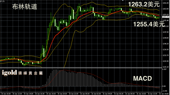 黄金阴阳烛录得末端阴烛回落,不过柱体较短,回调幅度较小,整体处于红色日均线中位,短线MACD显示呈中性,布林轨道小幅下探,黄金价格短线或继续小幅回调至1255美元附近。