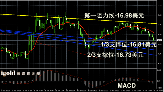 白银阴阳烛录得波段回调趋势明显,末端录得阴烛增多,短线MACD显示弱势空头主导,白银价格晚上或继续向16.85美元附近回落,若跌破或继续看跌至16.76美元附近,高位重回17美元之前,看涨动力或不足。