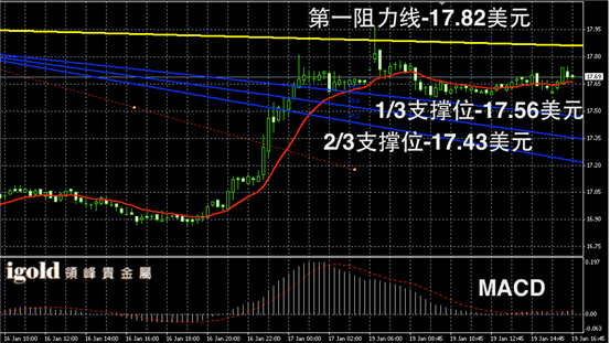 白银阴阳烛录得柱体聚焦明显,整体处于红色日均线中位,短线MACD显示呈中性,白银回调速度放缓,美盘时段或继续横盘运行,晚上9点前后低位或可参考17.6美元,若跌破偏于继续回落,高位17.8美元附近阻力较大,成功突破或继续上涨,否则整体弱势偏空。