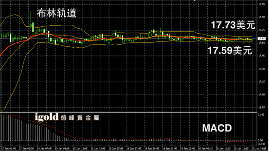 白银阴阳烛录得柱体非常短,布林轨道区间收窄,短线MACD显示呈中性,白银价格午后或继续在17.65美元附近横盘运行。低位若探破17.6美元,或继续小幅下探至17.53美元附近,若成功突破17.7美元,或进而上升至17.76美元附近。
