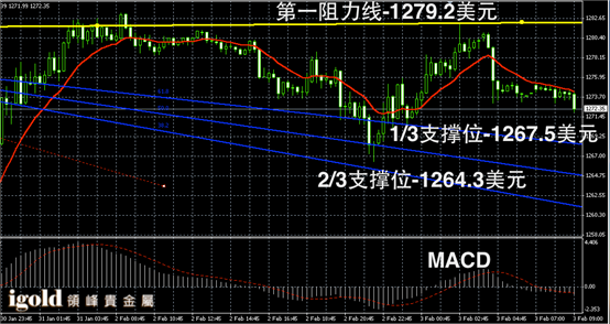 技术回顾:昨晚的评论中,我们提醒投资者留意低位支撑,并且明确指出金价若跌破1274美元,金价会向1268美元附近下探,这一判断与昨晚的走势完全相符。
