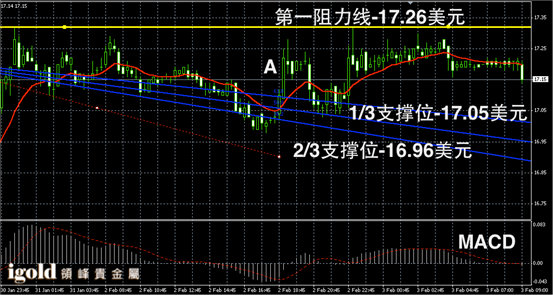 白银阴阳烛录得柱体整体处于红色日均线中位,末端阴烛增多,短线MACD显示呈中性,白银价格或小幅持稳后回升至17.2美元附近,短线运行区间可参考阳烛A的高低价。