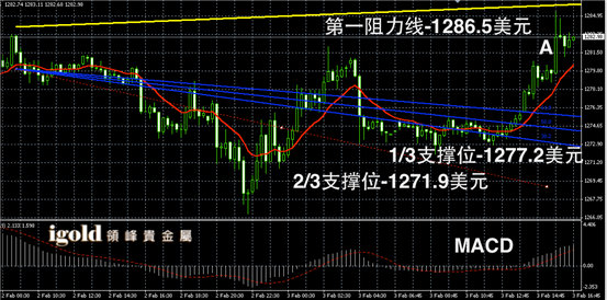黄金阴阳烛录得反弹后,末端柱体收短,短线MACD显示多头主导,金价晚上或首先在阳烛A的高低价区间进行调整,持稳1281美元后,或继续向1285美元附近攀升。低位支撑可分别参考1279和1276美元。