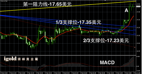 白银阴阳烛录得后期阳烛增多,且大幅高于红色日均线,短线MACD显示多头主导,白银价格或在17.5美元附近小幅回调,随后或再次上升至17.63美元附近。低位回落运行区间可参考阳烛A的高低价。