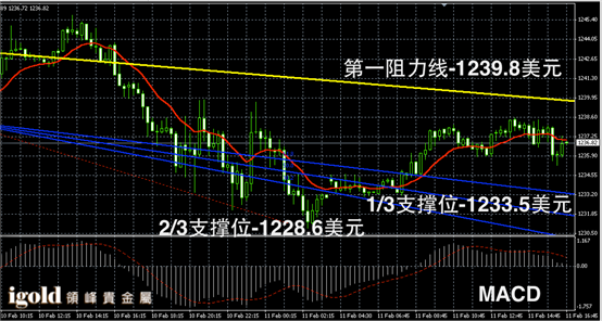 黄金日线走势录得阳烛收短,阴烛回落,RSI录得42暂时持平,小时线上柱体低于红色日均线中位,有所承压。国际金价短线触及至1230美元附近后,或已触底,未来或在1237美元附近横盘运行,整体运行区间可参考1232-1243美元区间。