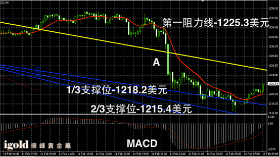 黄金阴阳烛录得短线阳烛回升,后期柱体小幅高于红色日均线,短线MACD显示弱势空头,黄金价格短线形成了U型反弹,上午或向1224美元附近回升,若突破或继续在阴烛A的区间上探,否则或再回落至1221美元附近横盘运行。