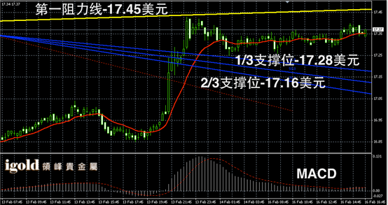 白银阴阳烛录得柱体较短,整体聚焦在红色日均线中位,短线MACD显示呈中性,白银价格或小幅上探17.43美元附近,若有效突破17.45美元,多头或继续扩大,低位支撑建议首先留意17.25美元附近。