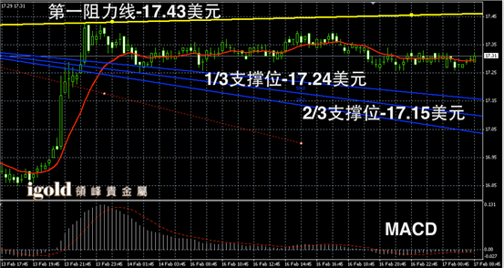 白银阴阳烛录得聚焦明显,整体处于红色日均线中位,短线MACD显示呈中性,白银价格短线或继续浮动在17.3美元上下,并提醒投资者留意17.25美元附近支撑,若跌破空头或扩大。