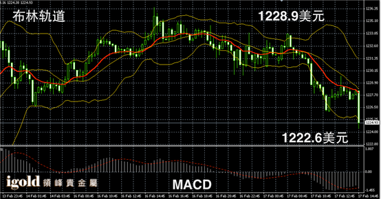 黄金阴阳烛录得阴烛大幅增多,后期布林轨道转为下探,短线MACD显示空头主导,黄金价格午后建议首先关注1222美元附近支撑,若跌破空头或大幅增加,否则或偏于持稳在1226美元附近。