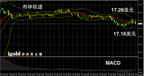 白银阴阳烛录得柱体较短,整体处于红色日均线中位,布林轨道小幅下探,白银价格午后或继续下探至17.15美元附近,若跌破或继续回落,高位在突破17.25美元前不建议大幅做多。