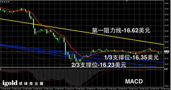 白银阴阳烛录得横盘运行趋势明显,柱体整体处于红色日均线中位,短线MACD显示呈中性,白银价格或继续在16.45美元附近运行,高位可参考16.55美元附近,若突破或小幅上探,低位支撑则可首先参考16.4美元附近。