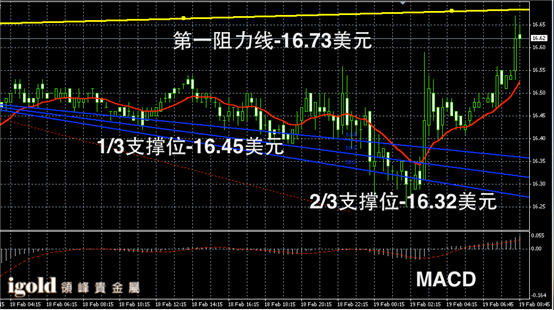 白银短线录得阳烛增多,且高于红色日均线,短线MACD显示弱势多头主导,白银价格上午或向16.7美元附近攀升,低位支撑可首先参考16.5美元和16.3美元附近。