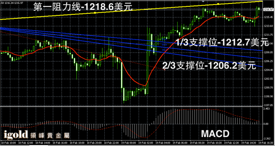 黄金阴阳烛录得柱体处于红色日均线中位,聚焦明显,短线MACD显示弱势多头主导,黄金价格或在1215美元附近持稳后,向1220美元附近攀升。低位支撑可分阶段参考1210美元和1204美元。