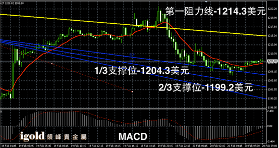 黄金阴阳烛录得下行后,末端柱体小幅回升,短线MACD示呈中性,黄金价格上午或在1209美元附近持后,不断向1213美元附近回升。低位支撑可首先参考1206美元附近。