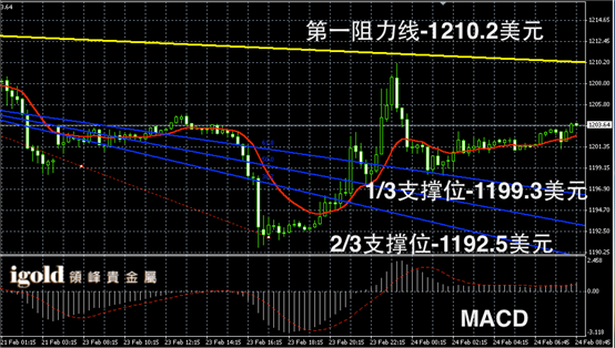 黄金阴阳烛录得下行回升后,末端柱体收短,整体处于红色日均线中位,短线MACD显示弱势多头主导,黄金价格上午或小幅上探,高位若突破1205美元,或进一步上升至1208美元附近,低位支撑建议首先参考1199美元附近。