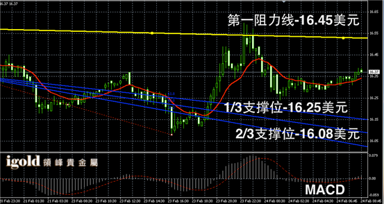 白银阴阳烛录得波段运行趋势明显,末端柱体小幅高于红色日均线,短线MACD显示呈中性,白银价格上午若突破16.4美元,或小幅上涨至16.46美元附近。低位支撑建议首先参考16.25美元附近。
