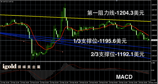 黄金阴阳烛录得后期阴烛增多,末端柱体低于红色日均线,短线MACD显示弱势空头主导,黄金价格晚上严防1197美元附近支撑,一旦跌破或向1193美元附近滑落,高位若重回1200美元,可小幅看涨。