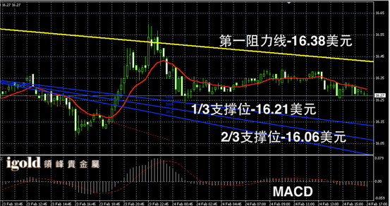 白银阴阳烛录得柱体下探后,末端录得十字星,回落有所放缓,短线MACD显示弱势空头主导,白银价格或偏于横盘运行,低位支撑可分阶段参考16.25和16.15美元附近,高位突破16.35美元前,不建议大幅看多。