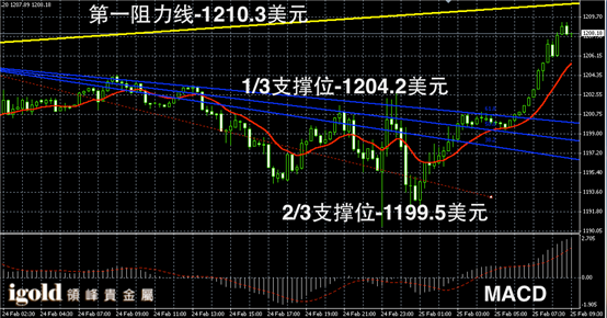 黄金阴阳烛录得末端阳烛回升,大幅高于红色日均线,短线MACD显示多头主导,金价上午或首先回落持稳在1206美元附近,高位突破1210美元,或进而上涨至1213美元,低位支撑可首先参考1204美元。