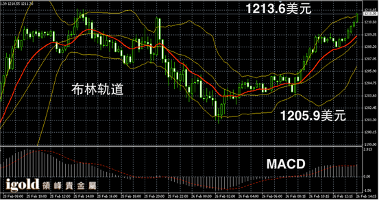 黄金阴阳烛录得阳烛大幅增加,且高于红色日均线,布林轨道录得区间上探,短线MACD显示多头主导,金价在触及至布林轨道区间高位后,午后反弹动能或有所放缓,金价或首先回落至1210美元附近徘徊,若再次突破且持稳1212美元,或继续上升至1215美元附近,低位支撑可首先参考1207美元附近。