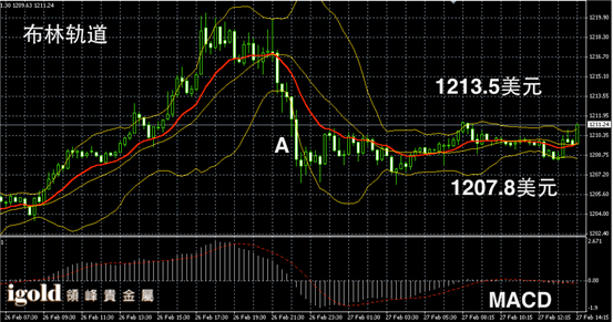 黄金阴阳烛录得阴阳烛间隔出现,布林轨道区间收平,短线MACD显示呈中性,黄金价格午后或有小幅上探,高位若突破阴烛A的最高价,或继续上升至1214美元附近,低位支撑仍然首先参考1207美元附近。