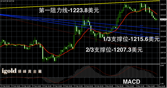 黄金阴阳烛录得末端阴烛增多,且低于红色日均线,短线MACD显示多头回落,黄金价格短线或首先区间横盘运行,晚上8点前后,再跟随美指进行反向波动,低位若跌破1215美元,空头或扩大至1211美元附近,高位突破1223美元前不建议大幅做多。