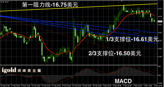 白银阴阳烛录得回落趋势明显,末端阴烛增多,且低于红色日均线,短线MACD显示呈中性,白银价格或在16.7美元附近横盘整理,低位若跌破16.65美元,空头或扩大。