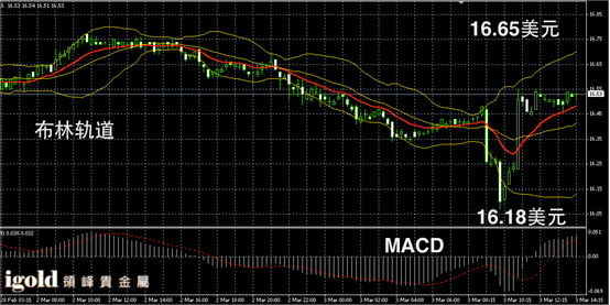 白银阴阳烛录得阳烛回升,后期柱体高于红色日均线,短线MACD显示多头主导,布林轨道区间扩大,白银价格午后或在16.55美元附近持稳,高位若突破16.6美元,多头或扩大,低位支撑可首先参考16.35美元附近。