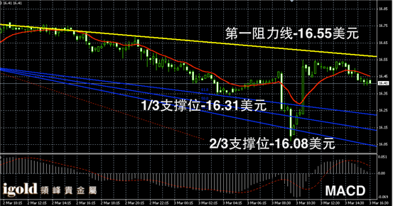 白银阴阳烛录得末端柱体收短,整体处于红色日均线中位,短线MACD显示呈中性,白银价格或在16.45美元附近横盘整理。短线运行区间可参考16.35-16.55美元区间,晚上8点前后若有突破可顺势看跌看涨。