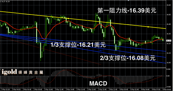 白银阴阳烛录得后期柱体收短,横盘运行趋势明显,短线MACD显示呈中性,白银价格上午持稳16.3美元后,或向16.4美元附近攀升,低位支撑可首先参考16.2美元附近。